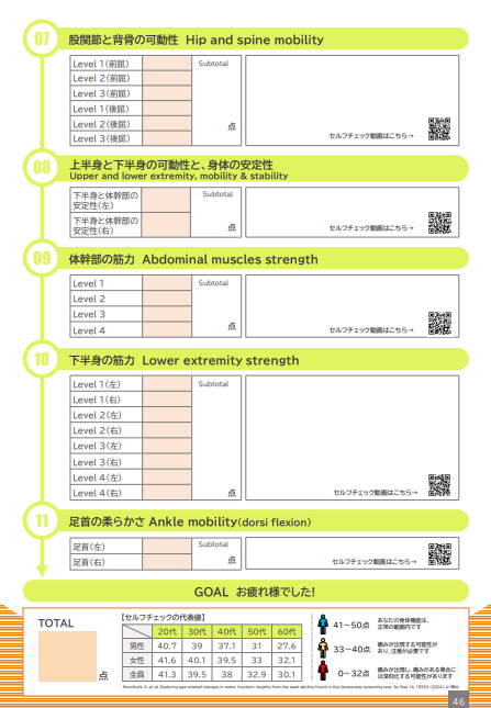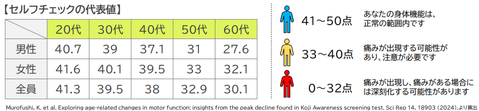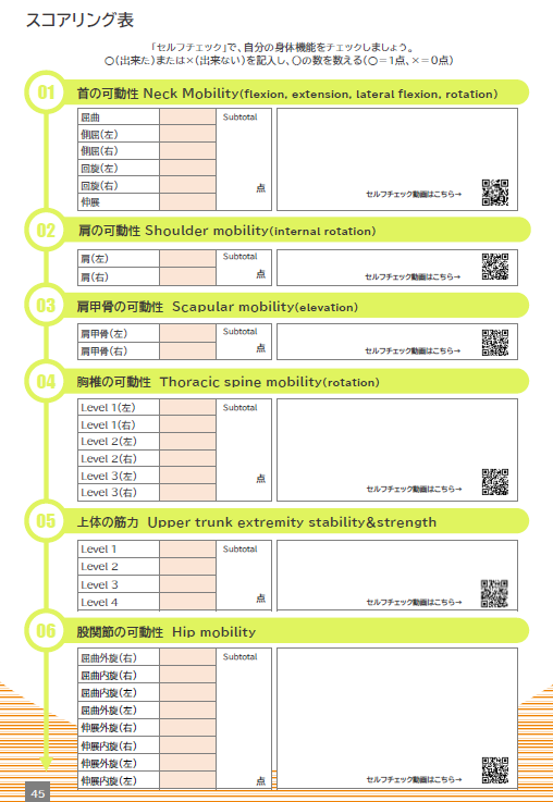 運動・スポーツを実施することで得られる効果は、体力向上、健康増進、生産性向上など多様です。この効果を高めるには、現在の自身の身体機能の状態を理解し、自身に適した運動・スポーツをすることが大切です。まずは、「セルフチェック」スコアシートにて、自身の身体状態を知り、日常生活における体力向上や怪我の予防等に役立てましょう!